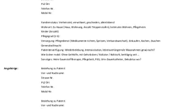 Hilfreich und unerlässlich für das Pflegepersonal sowie die Ärzte im Krankenhaus, v.a. Geriatrie, sind weiterführende Informationen bzgl. des Patienten, dessen aktuelle Versorgung, Mobilität und Lebensumfeld sowie der sich kümmernden Angehörigen und der möglichen weiteren Versorgung nach Beendigung des Krankenhausaufenthaltes.