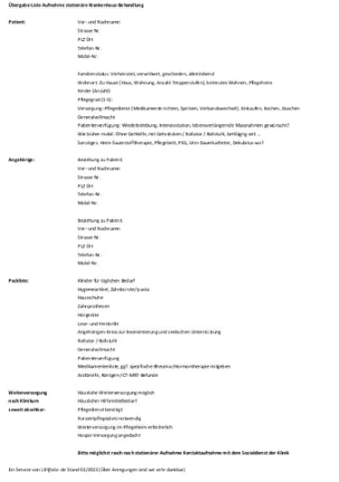 Die Liste sende ich bei Interesse gerne zu. Bitte benutze hierfür das Kontaktformular mit Kommentar "Übergabeliste stationärer Krankenhaus-Aufenthalt".